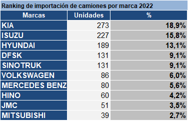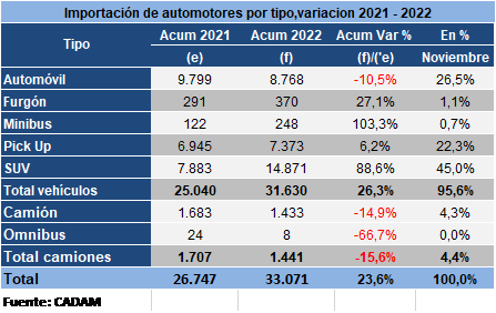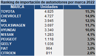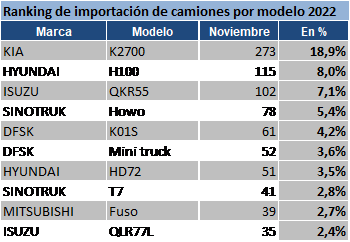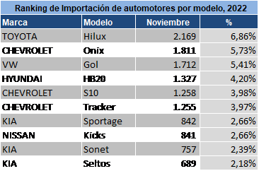 Al mes de noviembre, se registró la importación de 33.071 vehículos livianos y camiones nuevos, lo que representa un aumento de 23,6% más respecto al 2021, cuando fueron importados 26.747 unidades. Los vehículos livianos presentan un incremento de 26,3%, con 31.630 unidades importadas. Los furgones tuvieron una variación positiva de (27,1%), minibuses (103,3%), pick up (6,2%) y suv (88,6%). Mientras que los automóviles presentaron un descenso de -10,5%. Por otro lado, la importación de 1.441 camiones nuevos dejó como resultado una disminución de -15,6% en comparación al cierre de noviembre del año pasado. Los camiones descendieron -14,9%, al igual que los ómnibus (-66,7%) Ranking de marcas. En cuanto a marcas, al mes de noviembre de 2022, con 15,3% Toyota encabezó la lista con mayor volumen de importación de vehículos livianos por delante de Chevrolet (14,9%) y Kia (12,5%) En el primer lugar de los vehículos livianos más importados, Toyota Hilux se posicionó con 6,86% de participación, seguido por Chevrolet Onix (5,73%) y Volkswagen Gol (5,41%) Por su parte, con 18,9%, Kia lideró el ranking de camiones. Seguido por Isuzu (15,8%) y Hyundai (13,1%) El primer puesto de los modelos de camiones con mayor porcentaje de participación lo tiene Kia, con su modelo K2700 con 18,9%, por delante de Hyundai H100 (8,0%) e Isuzu QKR55 (7,1%)